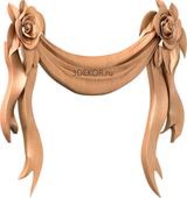 Резная гирлянда из лент, симметрично закрепленная объемными крупными розами. Вниз от роз свисают по две симметричные ленты разной длины с рассеченными краями. Декор может привнести в один интерьер помпезность и шик, в другой - классику и романтизм.
