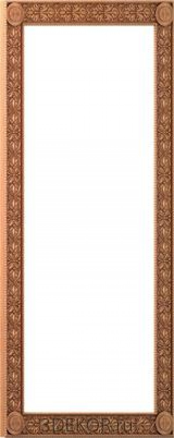 Прямоугольная рама из дерева с растительным орнаментом. Периметр рамы украшает резной узор: симметрично отраженные пятилистники соединены крестом с округлыми концами, который по краям обрамляют стилизованные листья. В углах изделия орнамент прерывают круглые ребристые вставки с крестом посередине.