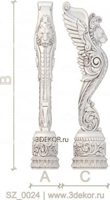 Столб заходной в форме крылатого мифологического существа - грифона. Резную фигуру со змеиным туловищем и львиной оскаленной мордой обрамляют детально проработанные крылья. Основание столба украшает резной узор с растительными мотивами.