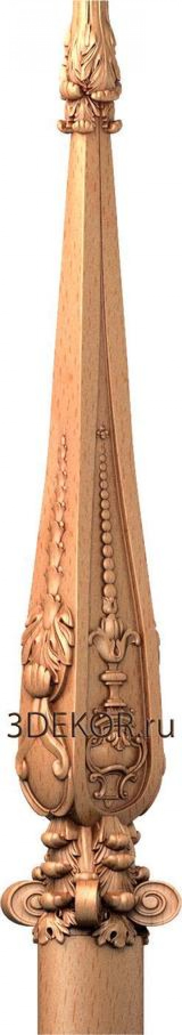 Изящный деревянный столб для лестницы выполнен в виде лампады. Образ огня представлен резным цветком и круглыми бусинами, поднимающимися вверх. Гладкая основа изделия украшена объемными завитками. Центральная часть и опора декорированы растительными узорами.