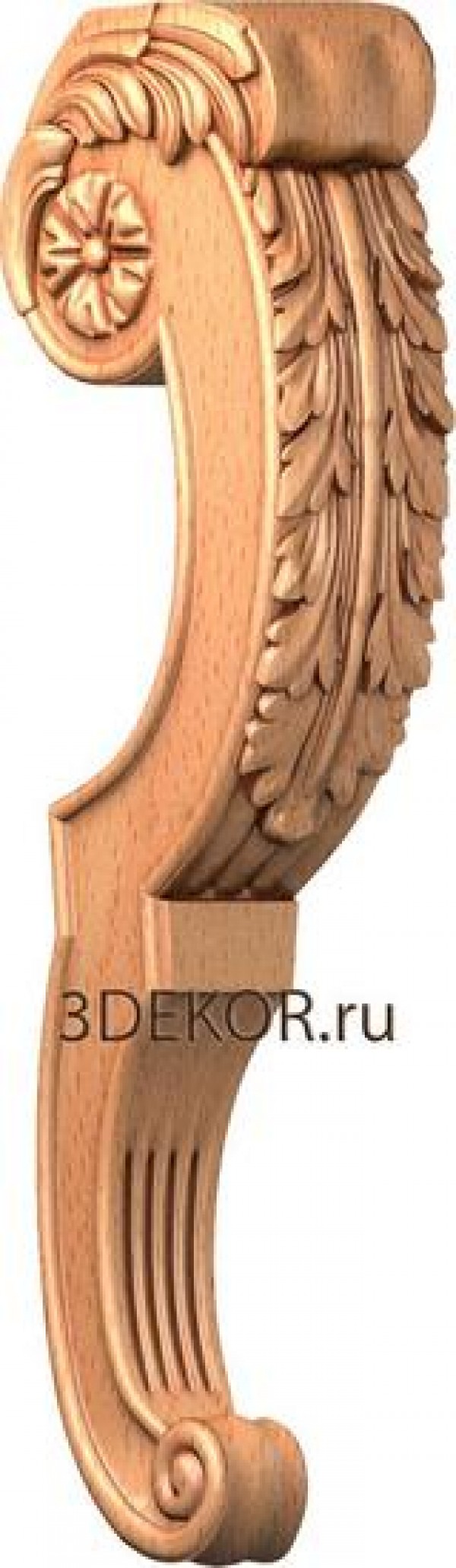Столб из дерева в форме буквы "S". Внешний вид изделия отдаленно напоминает морского конька. Спереди опору покрывает растительный орнамент, имитирующий листья винограда. В нижней части столба, зауженной книзу, сделаны четыре короткие насечки.